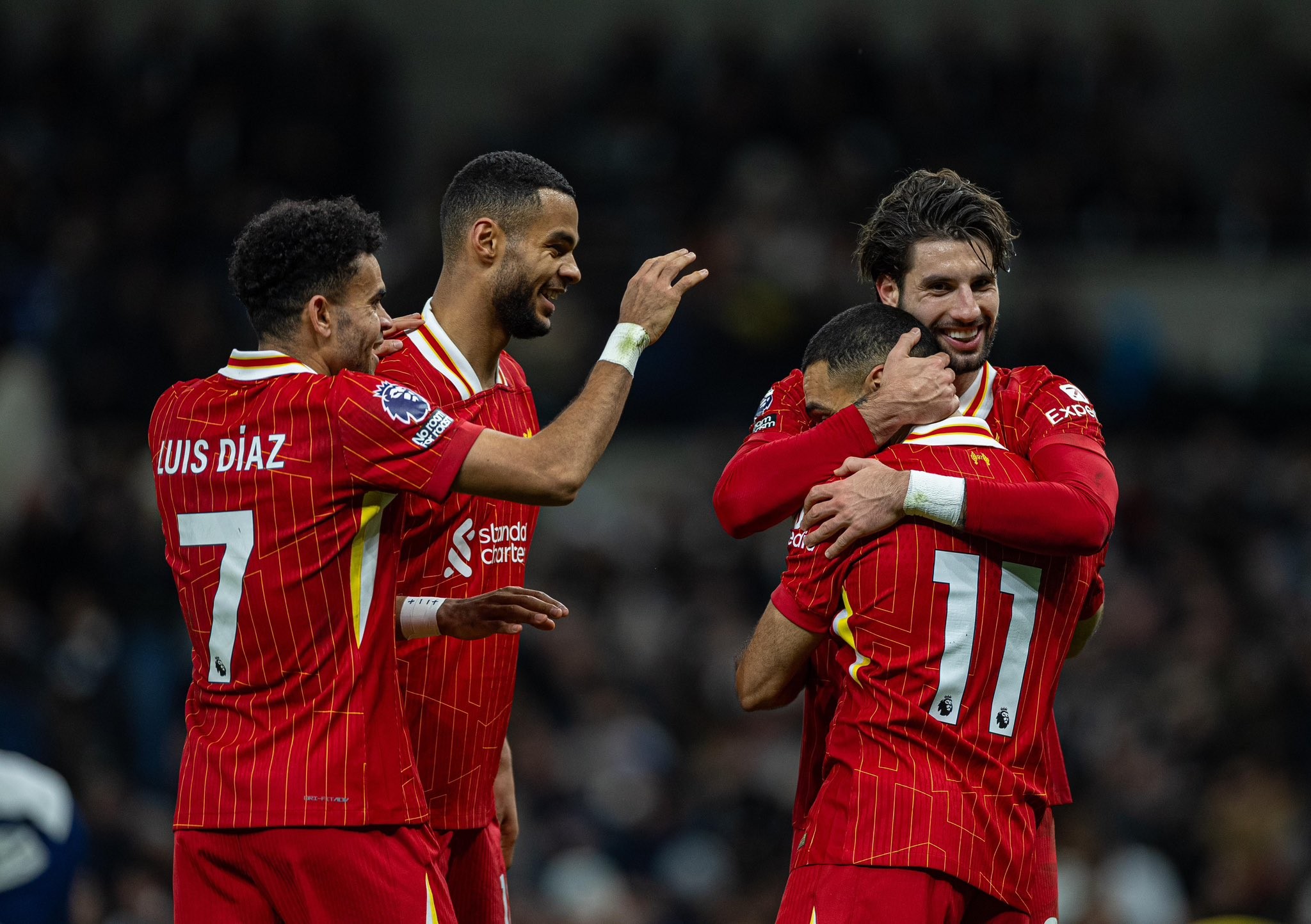 В составе «мерсисайдцев» по дублю оформили Мохамед Салах (54-я и 61-я минута) и Луис Диас (23-я и 85-я минута). Также по голу забили Алексис Мак Аллистер (36-я) и Доминик Собослаи (45+1-я). У «шпор» отличились Джеймс Мэддисон (41-я минута), Деяна Кулушевски (72-я) и Доминик Соланке (83-я).
